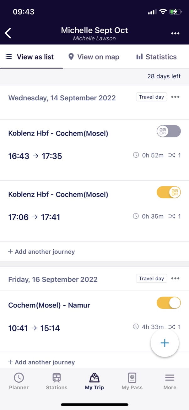 Below you’ll see just how flexible the pass is. On the left are two trains for the same journey, both saved to My Trip as I wasn’t sure whether I’d get the earlier connection. In the end I didn’t, so it was the later train from Koblenz that I made live (tap the circle so it turns orange). Only that train will be shown on the ticket/QR code, which you access via the Show Ticket button in My Pass.